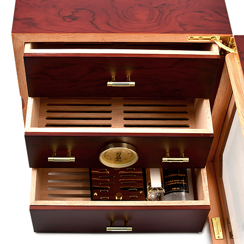 Встроенный акриловый полимерный увлажнитель расположен за тремя ящиками, обеспечивая дополнительное место для хранения сигар.