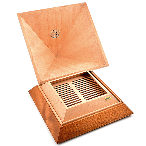 Этот роскошно оформленный хьюмидор в форме пирамиды, покрытый шпоном испанского кедра, станет настоящей жемчужиной вашего интерьера, а также незабываемым подарком.