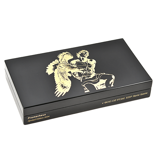 Набор "The God of Fire KKP Never Back Down", состоящий из четырёх сигар, — это исключительный лимитированный релиз, представленный в чёрном роскошном хьюмидоре из лакированного дерева, мастерски созданном компанией "Prometheus".
