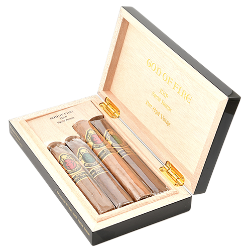 Внутри эксклюзивного ассортимента собраны одни из лучших сигар "God of Fire": 2 сигары формата Gran Toro и 2 сигары Piramide.