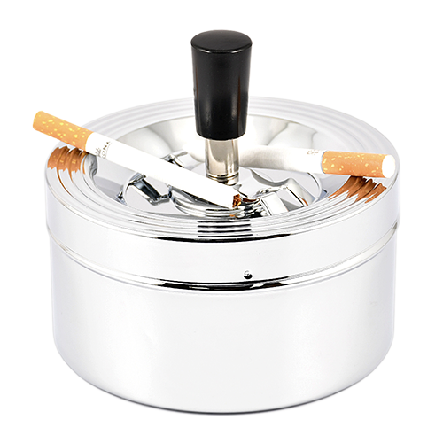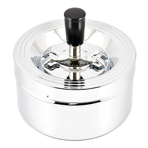 пепельница металическая, при нажатии на ручку, верхняя пепельница опускается с одновременным вращением и за счёт центробежной силы освобождается от пепла и окурков, которые попадют в нижнюю более вместительную пепельницу.
