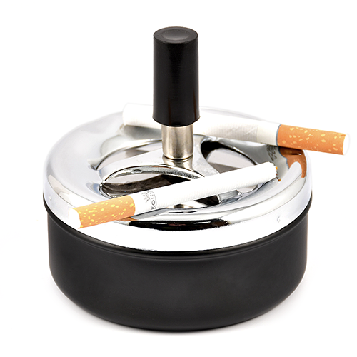 пепельница металическая, при нажатии на ручку, верхняя пепельница опускается с одновременным вращением и за счёт центробежной силы освобождается от пепла и окурков, которые попадют в нижнюю более вместительную пепельницу.