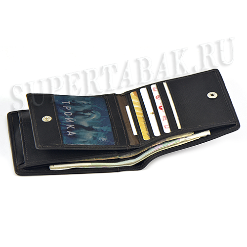 Отделение для банкнот, закрывающийся на кнопку кармашек для монет, полупрозрачный кармашек, 7 отделений для карточек, 3 отделения для бумаг