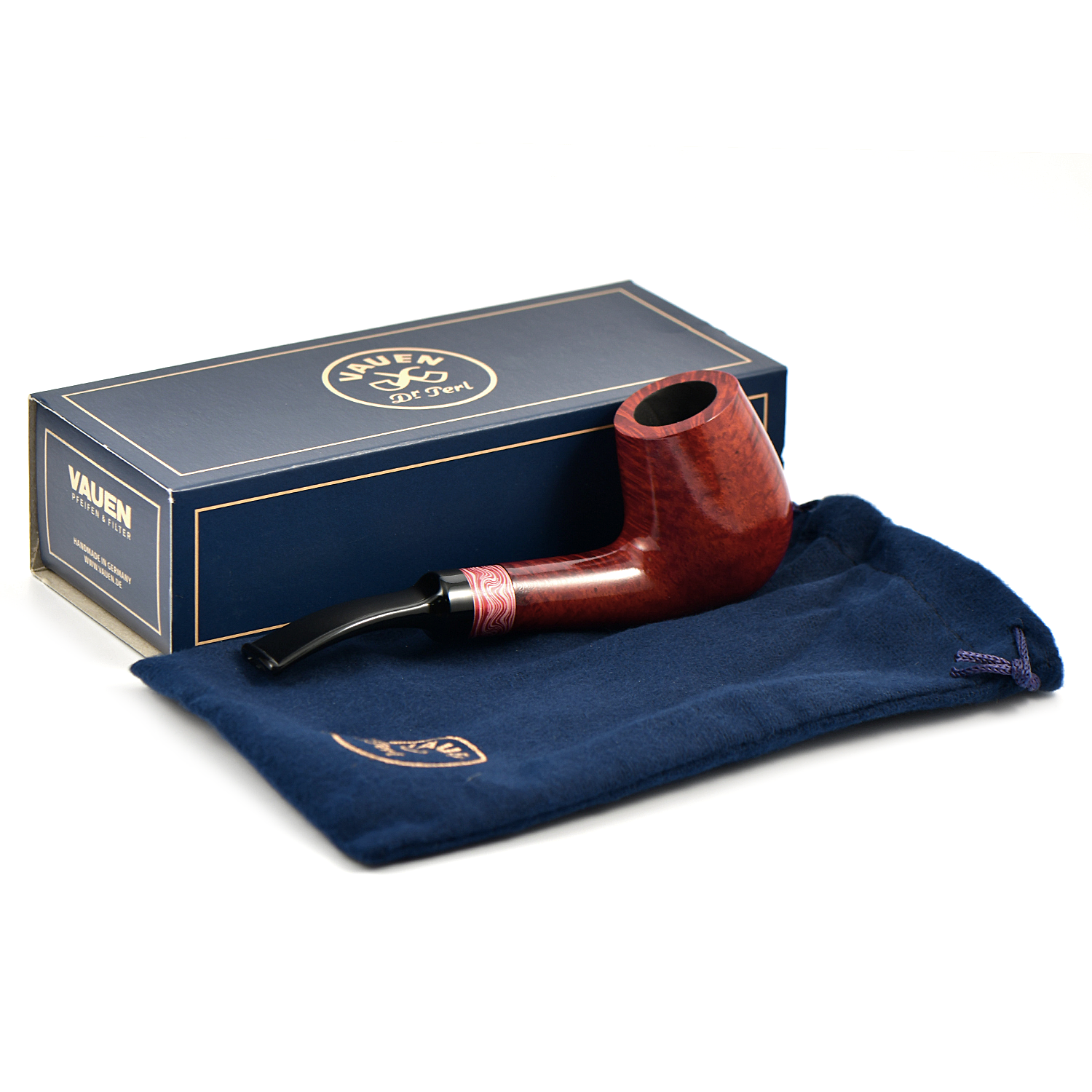 Еще одной специальной серией новинок Vauen, осени/зимы 2023 является серия с говорящим названием «Ros?», которая привлекает внимание розовым кольцом из анодированного алюминия, которому с помощью лазерной гравировки придается впечатляющая структура дамасской стали. Красноватый цвет отделки прекрасно подчеркивает естественную текстуру древесины бриара. В целом эта не самая обычная композиция производит свежее впечатление с неким загадочным антикварно-раритетным оттенком.