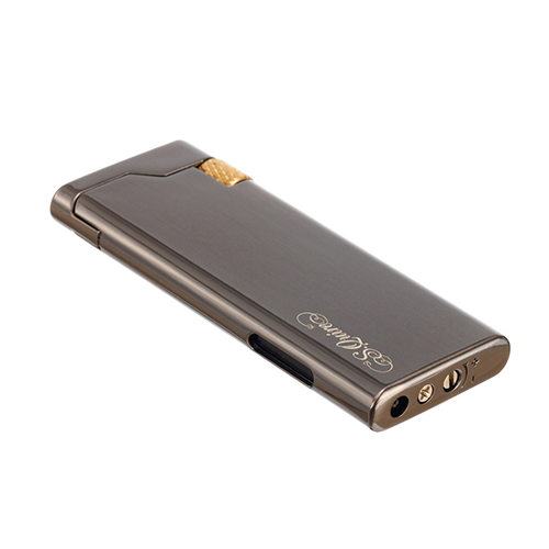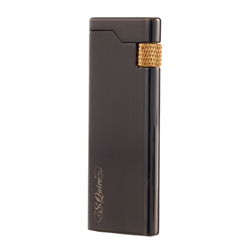 Стильная кремниевая зажигалка S.Quire с тонким корпусом цвета оружейная сталь с золотой каймой.