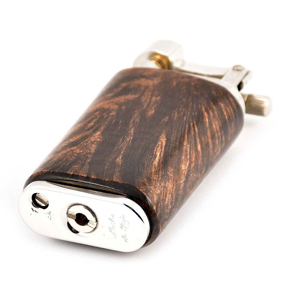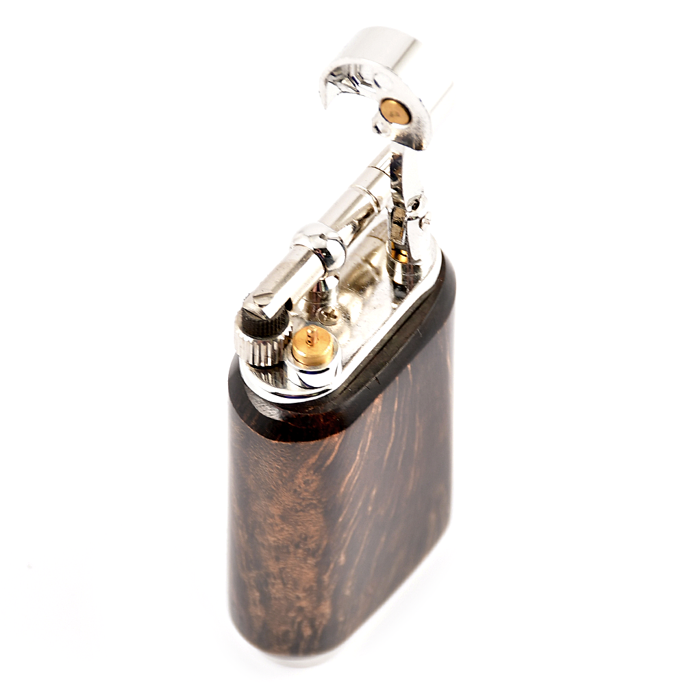 Внешний корпус зажигалки сделан из Бриара и инкрустирован серебряным украшением в виде трубки.