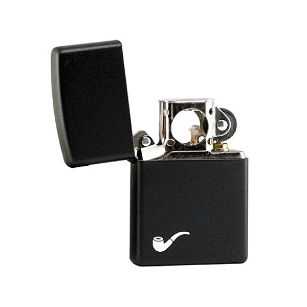 Черная матовая кремниевая бензиновая зажигалка для трубки. Классический дизайн.В правом нижнем углу- белый логотип трубки.