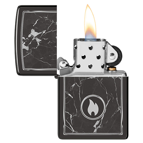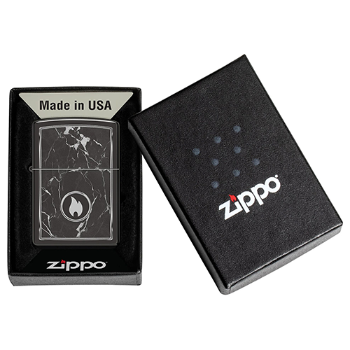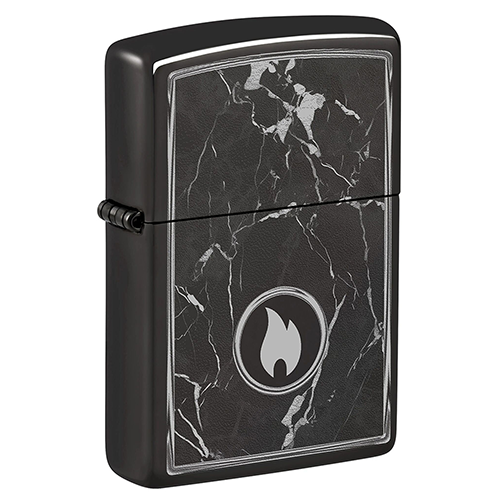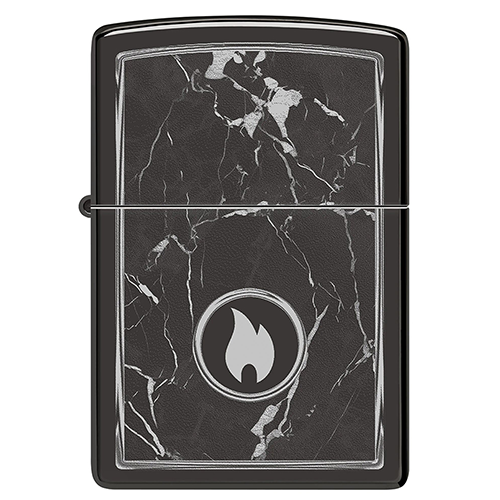 На поверхности этой классической зажигалки черного изображен завораживающий рисунок пламени Zippo, окруженный реалистично выглядящими мраморными прожилками.