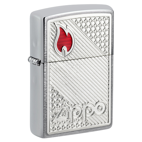 Настоящая классика Zippo! Украшенная роскошными узорами эмблема выгодно подчеркивает монохромный логотип Zippo и инкрустацию в виде красного пламени.
