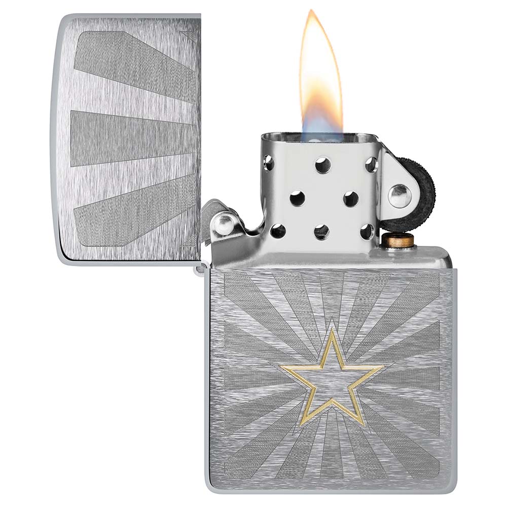 Звезда, излучающая яркие лучи, сияет блестящими латунными тонами в центре зажигалки с матовым покрытием Brushed Chrome – благодаря процессу двухцветной автоматической гравировки создается визуально многогранное пространство с объемными фигурами.